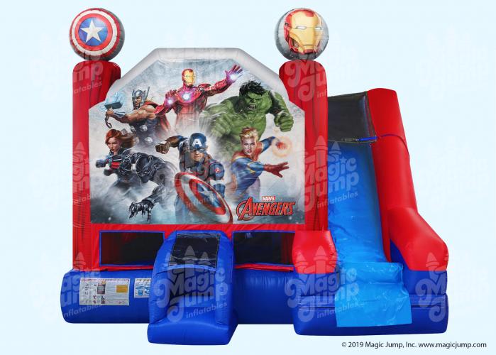 Let up to 5 heroes bounce and cool off at the same time, play basketball, or climb and slide into home. Made with premium materials by master craftsman, the AVENGERS combo is designed with fully licensed digital artwork and “Captain America” Shield and “Iron Man” Helmet embellishments on top of the front vertical pillars. It is a marvel-ous & incredible ride that is suitable for all occasions. This inflatable is compliant with the ASTM's revised standards (F2374-17) with additional safety features such as a safer entrance/exit ramp and emergency exit.