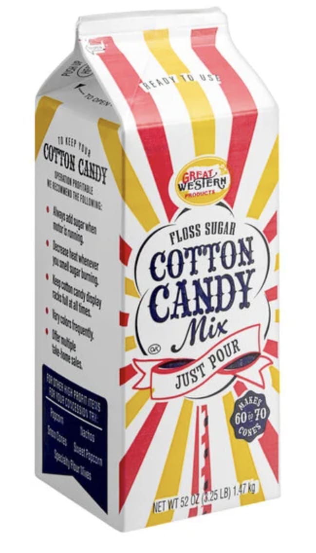 Irresistibly light and sweet cotton candy is sure to draw a crowd of customers at your concession stand, fair, or midway. Keep up with the demand and produce 60-70 cones with one 1/2 gallon carton of this Great Western blue raspberry floss sugar cotton candy mix! Unlike floss sugar concentrate, this cotton candy mix is ready to pour directly into your cotton candy machine. With no mixing required, this pre-mixed product contains a premium blend of sugar, raspberry flavoring, and blue coloring. Its eye-catching blue color offers a classic look, while its raspberry flavor adds just the right amount of fruity sweetness. Since pink strawberry and blue raspberry are such widely loved cotton candy flavors, your customers won't be able to resist! And when you're changing cotton candy flavors and colors throughout the day for eye-catching displays, you can reclose the easy-to-store floss sugar carton to keep the product fresh.