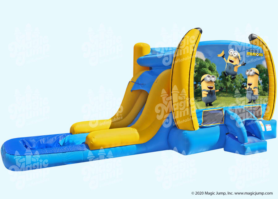 Go bananas by celebrating with your favorite despicable, mischievous Minions with Magic Jump's Official DESPICABLE ME EZ Combo Wet or Dry. It is a bounce house waterslide combo inflatable that features a special non-slip material that Magic Jump uses for safe use with water. The DESPICABLE ME EZ Combo Wet or Dry can be used either as a dry inflatable combo by simply rolling up the pool and securing it with hook and loop fasteners included, or as a wet inflatable combo by rolling out the pool and filling it with water to make for a splashing good time during those hot days!