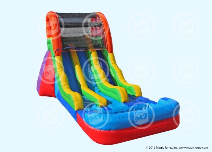 Magic Jump is back with a great new addition to our line of wet and dry inflatable slides. Our 17 Fun Dual Slide is the one of the newest addition to our slide family. Many days and weeks of research and development have gone into designing this beautiful slide. We have worked hard to make sure you don't have to. The slide features a easy-to-use water misting system that you will not have to remove and install or constantly re-adjust. The climbing area, top landing platform, and certain pool areas feature a unique non-slip material for a safer experience when being used as a water slide. The 17 Fun Dual Slide has a full pool with a raised wall for safety and to prevent water from splashing out. For states that do not allow pools, we can swap out the pool for a landing mattress. Drain flaps at the bottom corners allow for easy removal of any water that may get trapped inside the inflatable